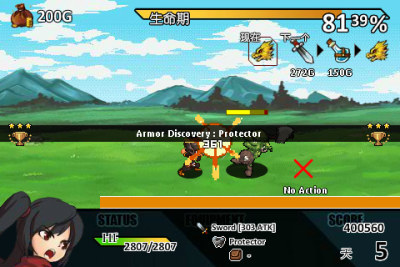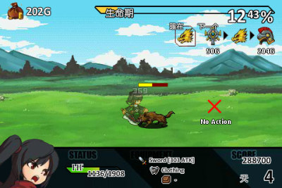 当玩家战斗的时候,除了用道具之外,其她都是自动进行;而遇到商店时。玩家可以选择要不要消费。在画面的左上角有玩家的金钱数量,上方有生命值。生命值会随着时间流逝,规灵就会游戏结束。左下方有玩家的血量,跟怪物战斗时会减少,归零一样会死亡。正下方是玩家的装备与道具,而右下方则是活过的天数与份数。