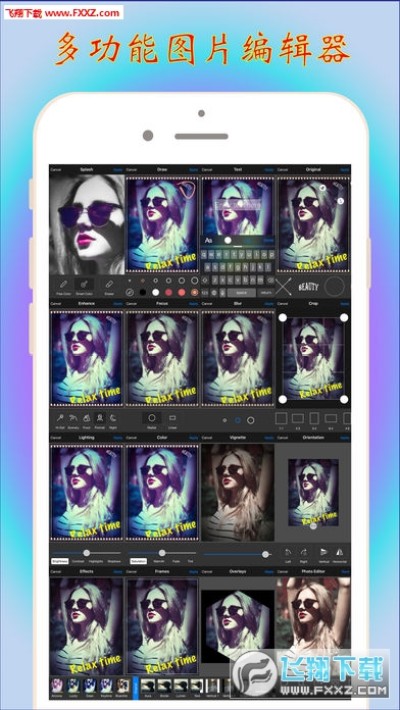 提供12种滤镜,背景模糊,裁剪,方向变换,层叠,羽化,相框,贴纸,对焦,增强,颜色,光线,文本,装饰文字,涂鸦,锐度,绘制,增白,瑕疵,消除红眼等强大功能。