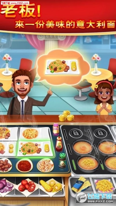 你既是厨房的主厨,要烹饪各种各样的美食来招待顾客;又是餐厅的老板,赚取顾客的金币和小费。精美的餐厅,丰富的美食,应有尽有。中餐、西餐和印度餐各式料理各有千秋,汉堡、炸鸡与可乐,甜筒、霜泣淋杯和巧克力杯,还有美味的蛋糕、披萨与寿司更是让人垂涎欲滴。