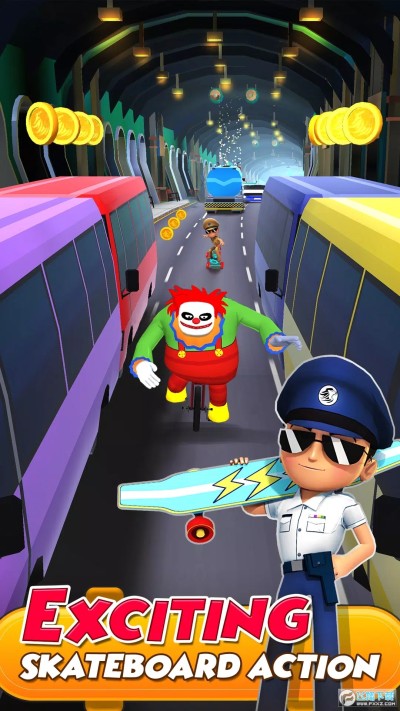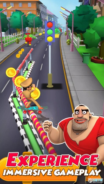 1、这是一款非常有趣的滑板跑酷游戏,游戏画面非常好玩炫酷,游戏人物卡通,城市场景搭建非常逼真。