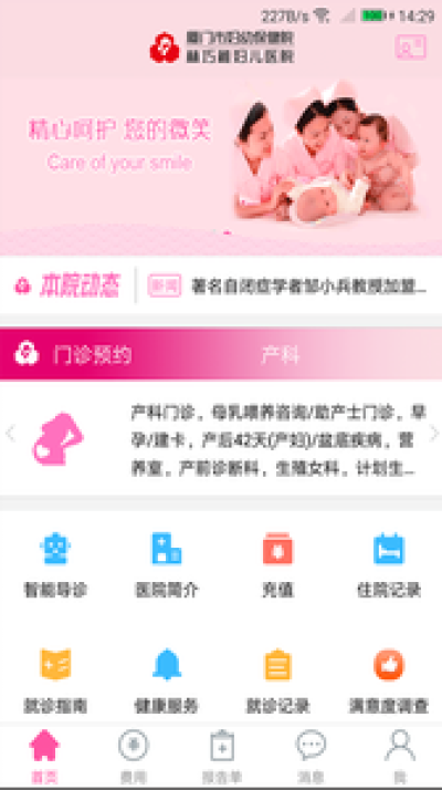 厦门妇幼app旨在医院现有服务基础上,通过预约挂号、取报告单、科室医生、智能分诊、医院导航、健康资讯、健康百科、费用查询等多种简化患者就医流程功能,减少就医等候时间,改善患者就医体验,提高医疗服务质量。