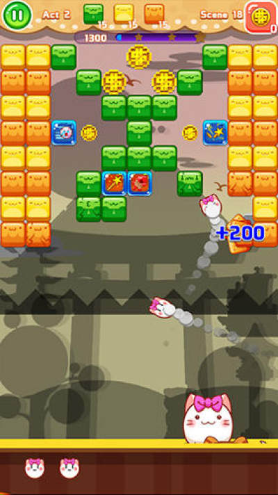 虽然看起来只是一个普通的弹珠游戏,但实际上却是有萌点之外的意外的,那就是玩家可以在屏幕上临时划出线来,作为挡板来反弹飞出去打碎砖块的小猫,运用好角度的话,能够更好地操纵小猫飞行的方向,真的是在同类游戏中非常独特的想法。