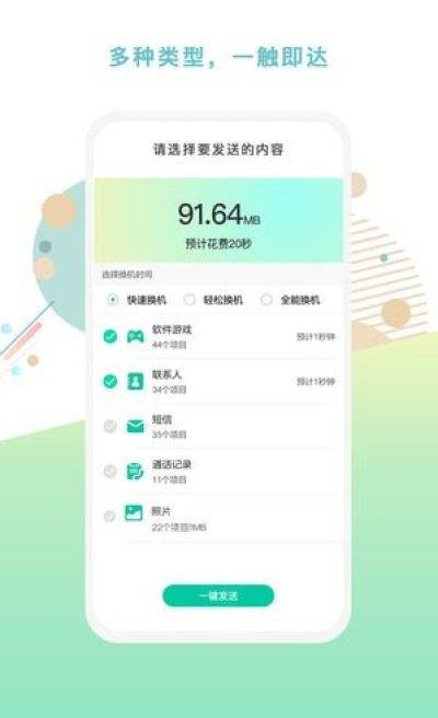 旧手机通讯录,短信,彩信,音乐,视频,应用和数据,用一点换机app一点即达新手机。