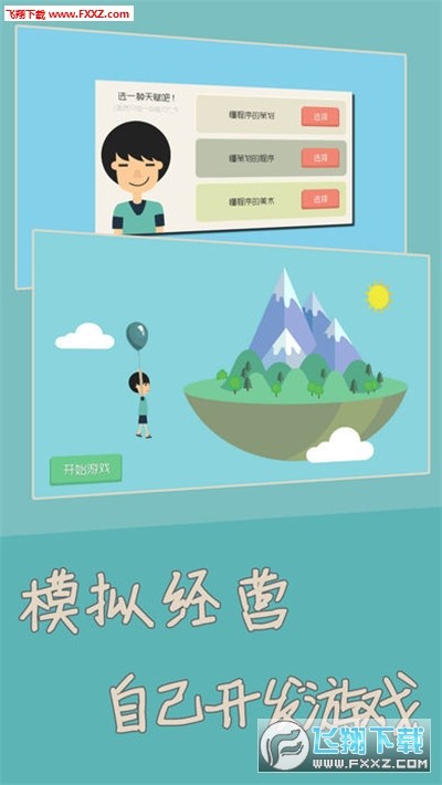 1.游戏开始需要在以下职业中选择一个:策划、程序、美术,但是在游戏过程中可以不断的提升各方面能力,最终实现自己全能开发者的梦想;
