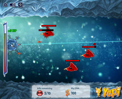 《红色灭绝》是一款横版动作类游戏,游戏的设定有点类似于《孢子》的细胞阶段,你要做的是利用你奖励和找到的装备武装起你的蓝色细胞,在血耗尽之前消灭一定数量的红色细胞则通过该关卡。游戏中除了各种武器增强之外,还可以通过DNA片段来增强属性。