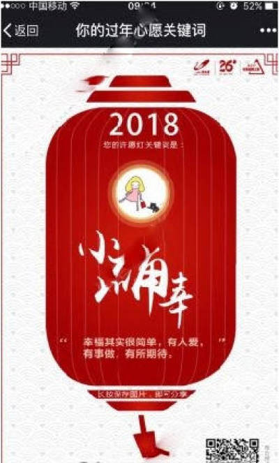 3、这个时候,你的过年心愿关键词就出来了哦,嗨客小编的是“小确幸”,大家看看自己的是什么哟。