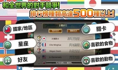 根据玩家输入的个人资料,游戏内的排行榜种类高达500种以上。除了总排行跟好友排行之外还有以国家、星座、喜欢的动物或是喜欢的食物等等各式各样分类的排行榜。玩家可在各排行榜中获取相应的称号图示,向朋友们炫耀一番;