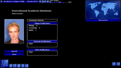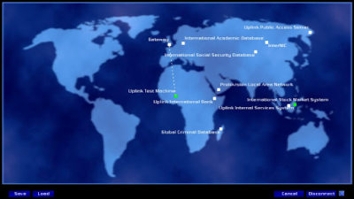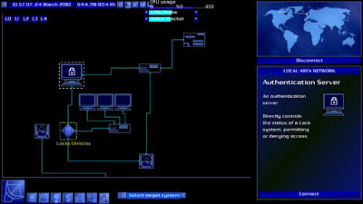 游戏界面上端显示的是日期、当前连接到的IP地址、CPU使用率、时间控制、以及世界地图。在CPU使用率以下的位置显示的是当前所运行的所有软件的列表和它们各自占用的CPU使用率,此外还有按钮可以调节每个程序所占用的CPU。时间控制按钮包括四个:暂停、二倍加速、三倍加速和正常速度。世界地图显示了你当前的连接路径,通过点击,你可以得到一张放大图来选择跳转路径。当前游戏正在运行时,你还可以通过其中的按钮来储存连接路径。画面底部有六个按钮,右下角用来放置你接到邮件或任务简报。最大的那个按钮可以打开软件目录,用来调用当前存在硬盘里的软件。其余的按钮使你能够了解你当前的硬件、文件存储、个人信息等情况,并可发送邮件。当你点击它们时,将在右侧出现相应的详细情况。