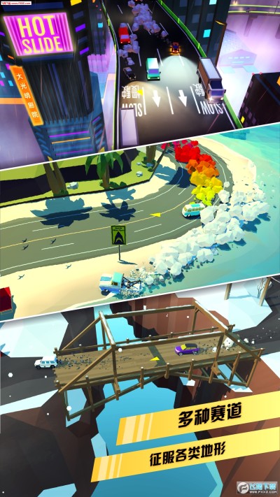 1、与全球漂移车手一争高下!炎热的海滩公路,冷冽的河床冰面,高耸的跨海大桥,甚至是拥挤的城市交通,都是展开漂移大战的绝佳场所;
