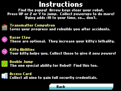 《救小狗的机器人》是《机器人救小猫的续作》,是一款以复古像素构图的冒险动作游戏。一开始玩家的机器人只能左右移动,玩家必须要利用道具来提升小猫的能力,利用小猫攻击敌人。游戏的地图就只有一个,玩家要在这个大地图中慢慢找出关键救出小狗。本次在冒险进行中都有纪录点,当碰到敌人死掉时,会回到纪录点重新开始,但还是会增加10秒的冒险时间,玩家可以在画面的左上角看到用了多少时间来过关。 小猫的攻击非常可爱,敌人也很搞笑,整体来说算是一款很好玩的冒险动作小游戏喔。