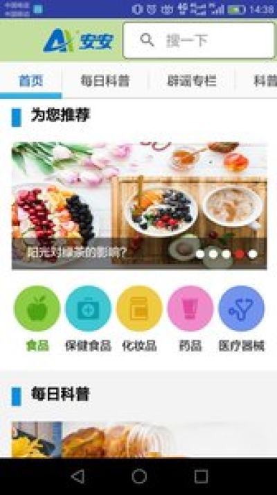 发布针对食品、保健食品、化妆品、药品、医疗器械的科普知识,对社会上的食药相关谣言进行官方辟谣,根据时令节气不断更新食药知识科普文章,为广大用户提供权威的食药科普知识。目前开辟了“每日科普”、“辟谣专栏”、“食药知识”、“公众查询”、“微课视频”、“法规标准”栏目。