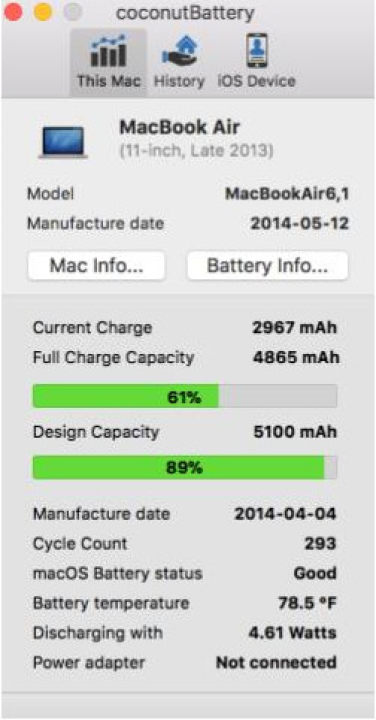 您还可以保存当前的健康信息,因此您可以看到您的电池随时间的变化。通过在线服务“椰子电池在线”,你甚至可以将这些信息与他人进行比较。