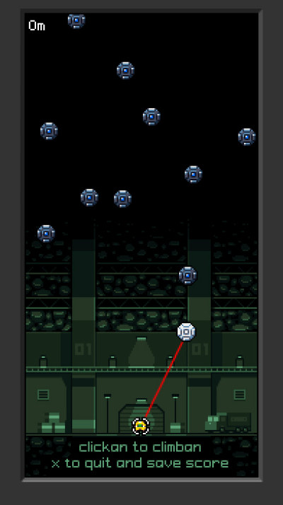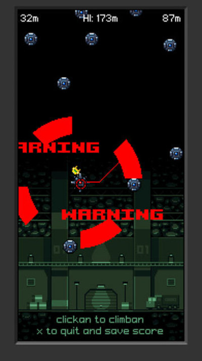 点击鼠标左键放出钩子,抓住绿色球体,使机器靠惯性向上,再次点击左键抓住上方绿色球体,这样一步一步向上。注意,蓝色的球体有时间限制,会发生爆炸。