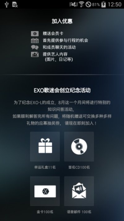 ÕâÀïÊÇexoµÄGLOBAL OFFICIAL FANCLUB ¡°EXO-L¡±¡£×¢²áºó£¬Íê³ÉµÈ¼¶ÈÎÎñ£¬¾ªÏ²µÄÓŻݽ«»áµÈ×Å´ó¼Ò£¡ÎÒÃÇÏò»áÔ±ÌṩÎÞÏßFANCLUB¿¨£¬Í¬Ê±¿ÉÒÔʹÓÃFan Board¡¢From StarµÈ¶àÖÖBBS¡£ÏÖÔھͰ²×°APP£¬¼ÓÈëEXO-L°É£¡