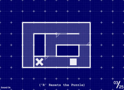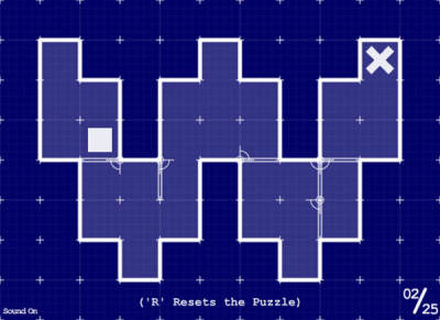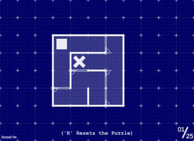 游戏的画面以蓝图作为场景,白色的点代表的就是你,游戏中的门都是可以用一定的动作开关的,根据门的位置和场景的不同,你需要费脑筋思考开门的顺序,最终到达终点。游戏包含有25个关卡,每通过一关,游戏的复杂程度就会上升。