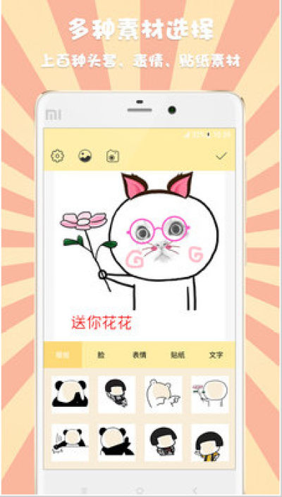 表情头像设计app是一款让你自己定制打造斗图表情头像的设计软件;本软件为您收集了上百种好玩的素材,只需简单的搭配即可制作你的专属表情,幽默搞笑、个性化十足,让你不再担心斗图没有合适的表情包了。 欢迎下载!!