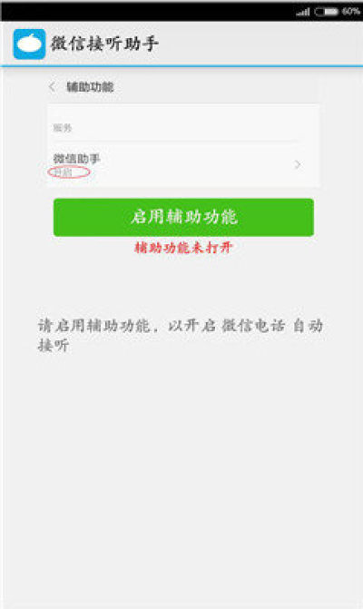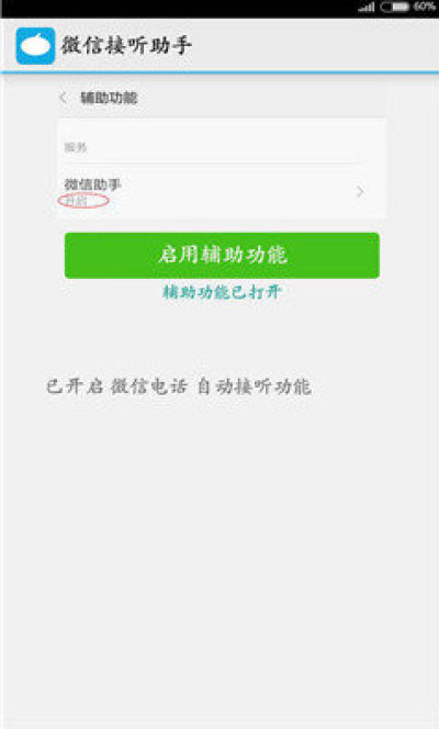 打开微信助手->启用辅助功能->开启微信接听助手服务