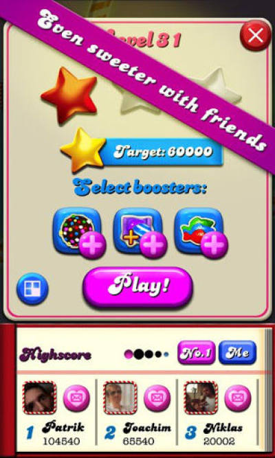 画面精美的三消游戏,游戏中玩家需要在一个行列中匹配三种糖果,从而通过一个有雪人和尼斯湖水怪的虚拟世界。游戏与Facebook有着很高的整合度