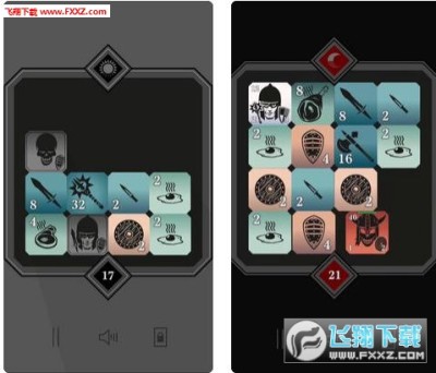 《BoneSwiper》同样是一款藉由滑动融合卡片以创造新局面的游戏,但是游戏中你不是把一个个相同的数字合成,而是要你自行合成角色的装备,进而与怪物进行作战。 在《BoneSwiper》游戏一开始,玩家在画面上会发现主角本身以及三种资源:剑、盾、食物,这三种资源的效果相信不用我多说。每当玩家滑动手指时,场面上的所有卡牌就会朝同一个方向移动,此时只要让主角能够朝资源卡的方向前进,就能够补充攻击力、防御力或是血量。