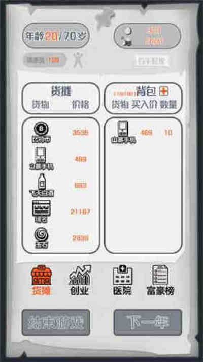 市场:点击物品可购买/出售,低买高卖,扩充仓库,完成资本积累