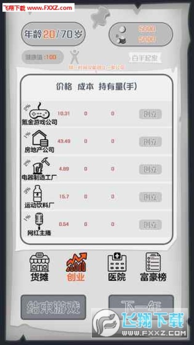 创业:创办公司时需要大笔投资,后期可追加或减少投入,公司会涨跌,可获取盈利