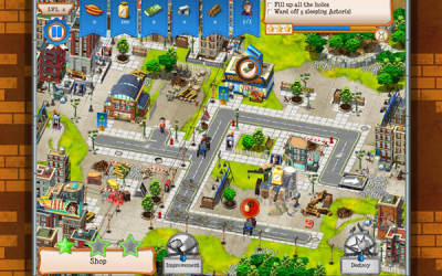游戏属于一款比较普通的时间管理类游戏,游戏以美国三十年代为游戏的背景,资源类型也恰当的换成了水泥、钢筋等物品,模仿老电影的开场动画让人印象深刻。游戏玩法与大多数的时间管理一样,稍微有点特殊的是生产的资源需要你点击之后才会慢慢送到总部,此外游戏中还会有打扮成金刚的演员挡路。