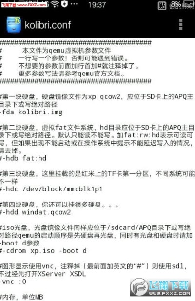 有比较才会有发现,这是修改之后的文件,这是相当于修改文件的路径,你镜像放哪里就改什么路径,例如我把镜像放在了/storage/sdcard1/APQ/。修改保存后退出文本编辑器,修改kolibri.conf的文件名称,你镜像什么名称就改什么名称,最好用英文或者数字,例如我的镜像名称为win2000.qcow2,就把kolibri.conf改为win2000.conf