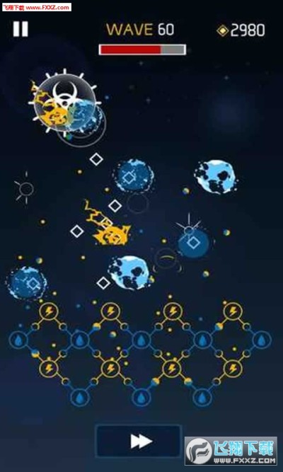 屏幕的设计很炫酷,高逼格的塔防类游戏,通过搭配设计胜利^_^)Y,胜利自己的防御消灭入侵的黑客细胞。很有意思,冷却时间短的闪电攻击不足,攻击强大的火焰冷却时间又太长,合理的排兵布阵才是制胜之道,而且相互不同属性之间还有加成效果,究竟鹿死谁手,到底能撑到多久。