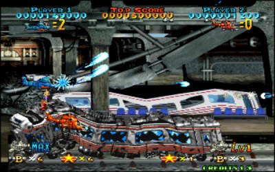 同样用CG绘制的背景和角色贴图以及游戏中穿插的3D视点转换已经把MVS的机能演绎到了极限,要知道MVS是一部2D底板,它没有任何3D加速能力,所有的CG成分都是预先制作好的。喜欢尝试各种横版射击的朋友可以玩下。