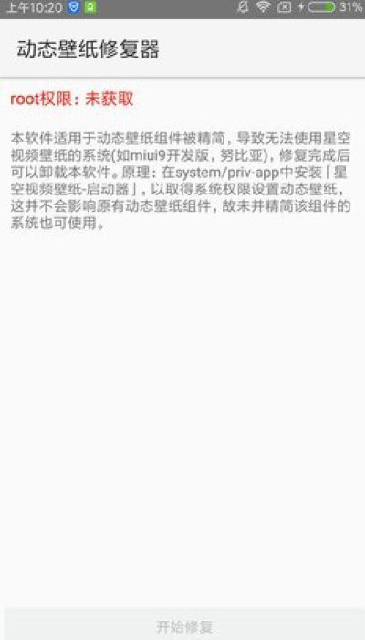 动态壁纸修复工具APP是一款修复星空壁纸因为动态壁纸组件被精简无法用的情况,体积小巧,操作简单,一键修复即可。在system/priv-app中安装「星空视频壁纸-启动器」,以取得系统权限设置动态壁纸,这并不会影响原有动态壁纸组件,故未并精简该组件的系统也可使用。