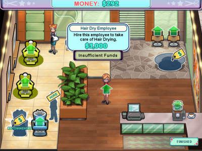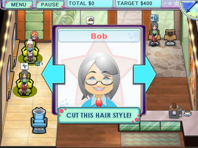 鼠标控制,点击拖动进门的顾客前往她们想要的服务,如洗头、理发、吹风、染发等,最后收费,游戏的每一关时间有限,所以你得尽可能快的完成任务。游戏中选择发型或者染发的颜色是根据切换时顾客的表情决定的,如果是笑脸就是她想要的。每个顾客都会有心情值,等待时间太久就会掉落,随之而来的就是分数和小费减少,可以用咖啡机小幅提升心情。