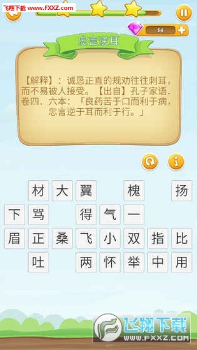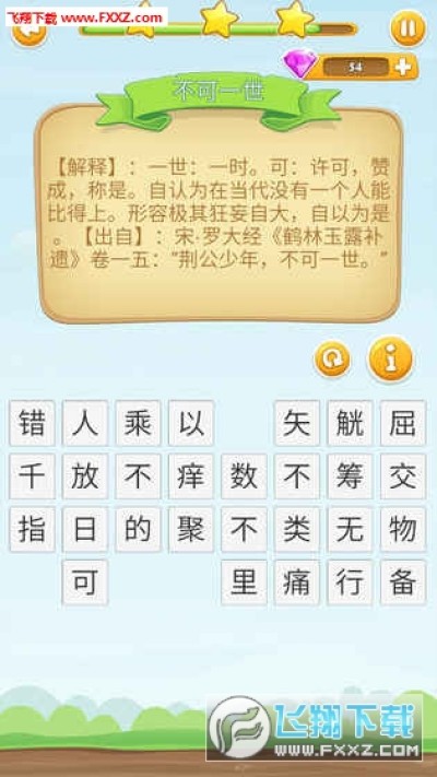 3、每次消除一个成语后,会显示当前成语的解释与出处,真正实现了寓教于乐,成语开心消消乐;