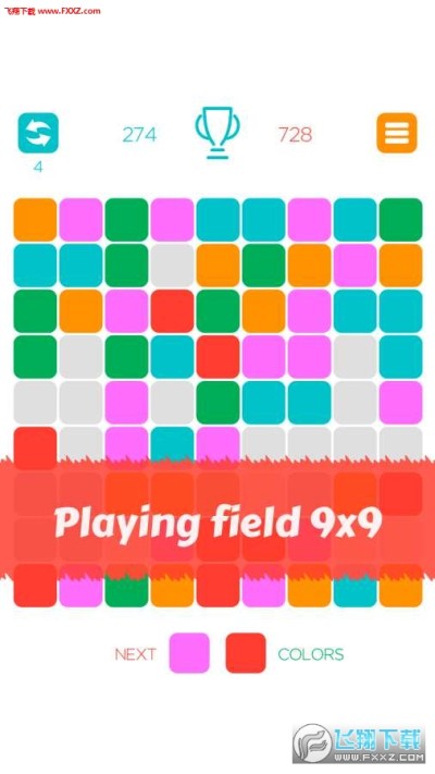 游戏发生在9x9格子的方形场地上,代表一系列动作。首先在棋盘上每转一圈出现在随机颜色为2个骰子的随机单元中。接下来,您需要将任何立方体水平或垂直移动到另一个空闲单元格中,如果在移动后您收集3个立方体或更多相同颜色的水平或垂直线条,则所有这些立方体消失。如果全场满了,你就输了。游戏的目标是收集最大点数。