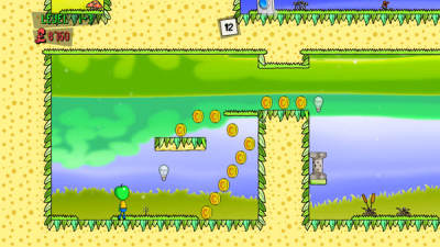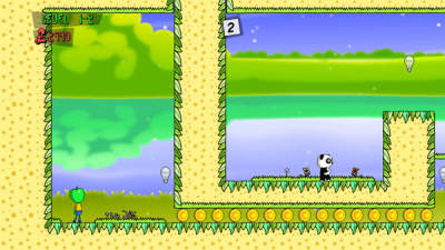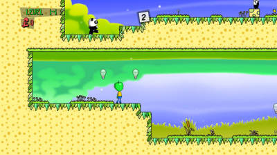 游戏画面采用了卡通风格,一个有趣的苹果头小人将在屏幕中上蹿下跳收集物品过关,游戏中没有掉路摔死一说的,游戏中的坑是与顶端连接的,一般会成为去往顶端的方法。游戏到后面还有不同颜色的敌人,需要用对应颜色的攻击来化解。