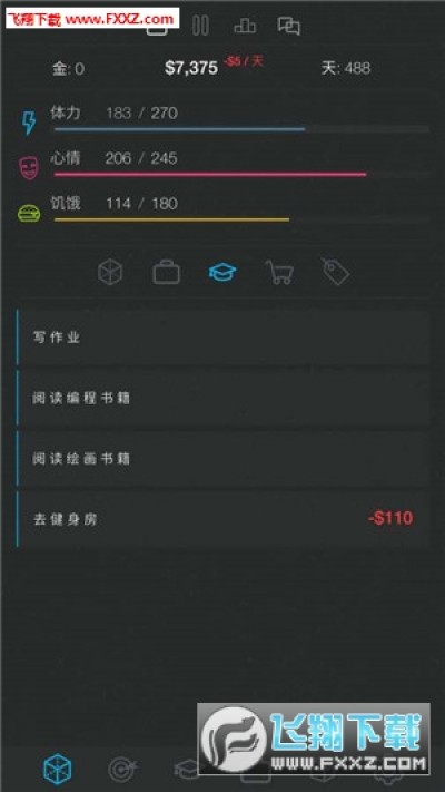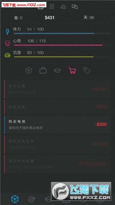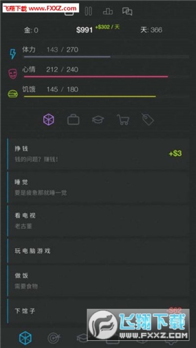 2、然后你有饥饿值,情感值,还有体力值去工作,你可以做你任何想做的事;