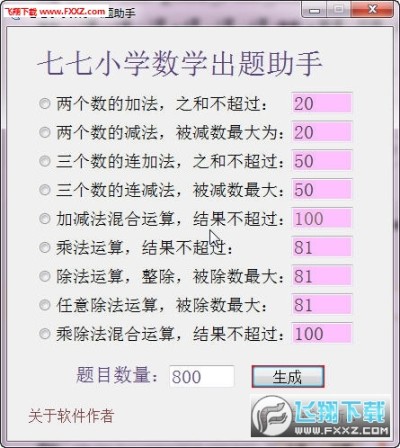 一次性最多可以生成200道不同的题目,也可以通过 增加 题目 按钮再在原先的题目上新增题目。可以组建自己的出题规则,保存规则,也可以保存题目,还可以另存题目,直接打印(均含答案)。目前是正整数出题规则,以后还会推出小数,分数的规则。