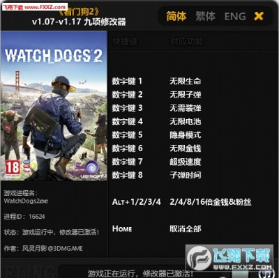 看门狗2 v1.07-v1.17 九项修改器,其主要的功能就是给玩家提供无限生命、无限子弹、无限电池、超级速度等等极为强大的功能,让你全面体验到游戏带来的快感,喜欢的玩家小伙伴可以来下载哦!
