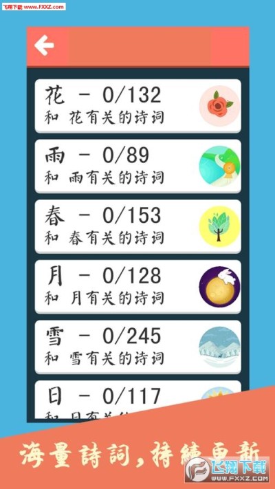 诗词飞花令,包括了上千条古诗词,根据描述事物的不同将诗词分类,请你将诗词连起来。