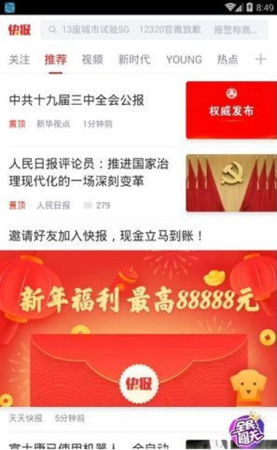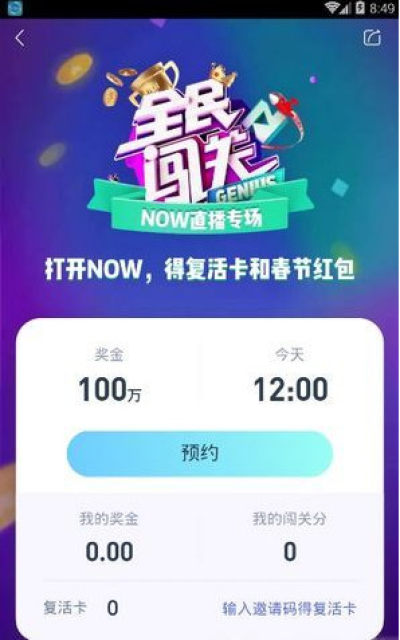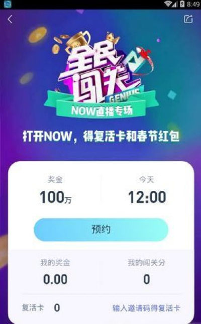 “全民闯关”,瓜分现金奖金全民闯关是一款直播答题节目,答对12题即可瓜分现金奖励。