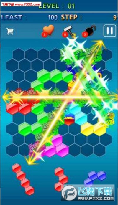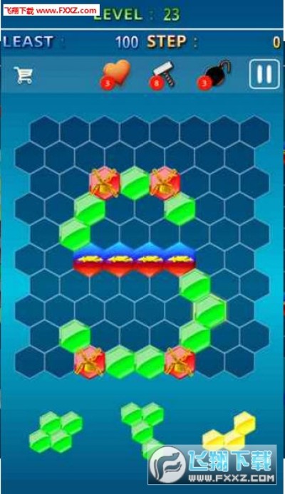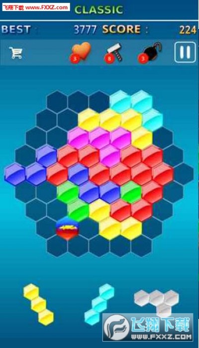 玩法很简单,拖动最下方的三个由六边形组成的积木块,放在上方的地图上,只要在地图上任意一个方向的格子被宝石填满了,就能消除它!积木块不能被旋转,而且有多种道具为你的游戏增加挑战和乐趣。