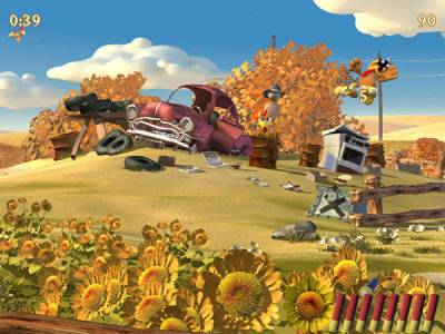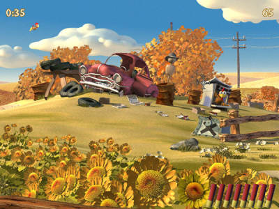 虽然是一款情节和操作都十分简单的射击游戏,不过一定会感觉到Phenomedia的有趣创意充满在游戏中,捅马蜂窝的敌人,幽闲的钓鱼者,蜗牛和打牌的刺猬,用铁锅档子弹的怪鸡都十分有趣。