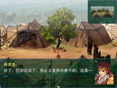 周冥皇在帐篷里, 正想着南诏复辟的事 ,手下一个士兵传达命令,说是元帅有时找他,於是到元帅帐篷,在途中遇到一个倒在地上的士兵王成(第一个支线,晕,倒下还拿着兵器),与之对话,得知他中了南诏的蛊毒,答应帮他找解药……接着,去找邹戎将军