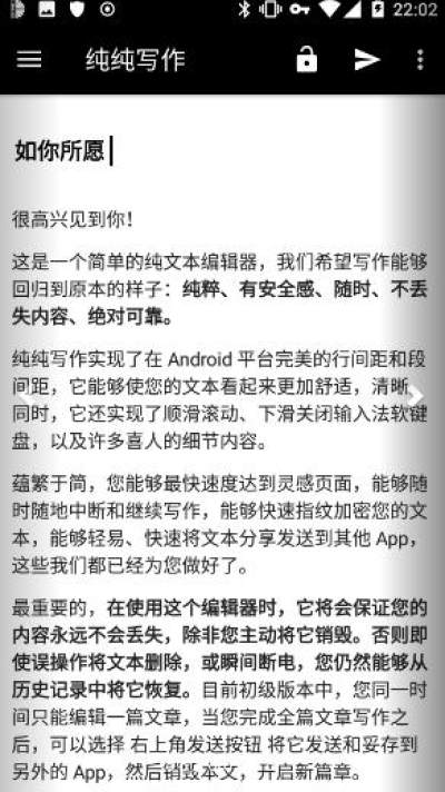 这是一个简单的纯文本编辑器,我们希望写作能够回到原本的样子:纯粹、有安全感、随时、绝对不丢失内容、具备良好的写作体验。