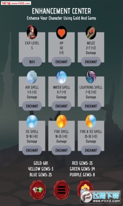 如果你死或不使用出口的门,你将失去你在地牢中收集的一半黄金。如果你需要红色药水,它会治愈你。使用黄金增加你的经验水平,这将增加你的健康点和近战伤害。使用宝石来强化你的武器和法术造成更多伤害。在战斗中,你匹配的瓷砖越多,伤害越大。