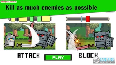 骑士任务 Knight Quest 的玩法很简单,游标在任何方块之上都可以点击,红色为格挡,黄绿为攻击,诀窍就是尽量提升攻击,速战速决,太在意血槽会很吃亏