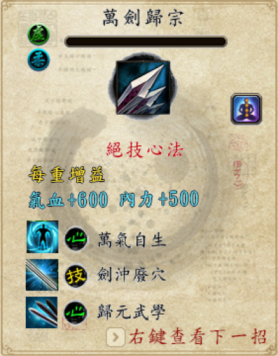 简单说下,万剑归宗有一个主动技能二个被动心法,
