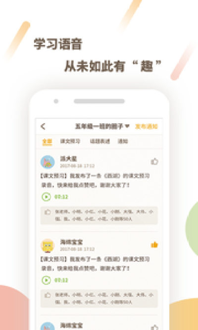有了班级圈,一起学习不孤单!老师的通知、同班同学的作业动态,在班级圈都可以及时查看,不仅能给你欣赏的同学点赞,还能得到老师的点赞哦!