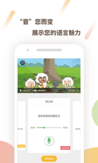 开启配音秀,立刻变身电影主角!配音秀提供各种热门配音、经典电影、经典动画资源,您可以根据提示进行逐句配音,系统将自动为您生成完整配音文件并进行智能语音评测,给出综合相似度得分;还可以将您的配音分享给朋友,或与小伙伴互相切磋,共同进步。