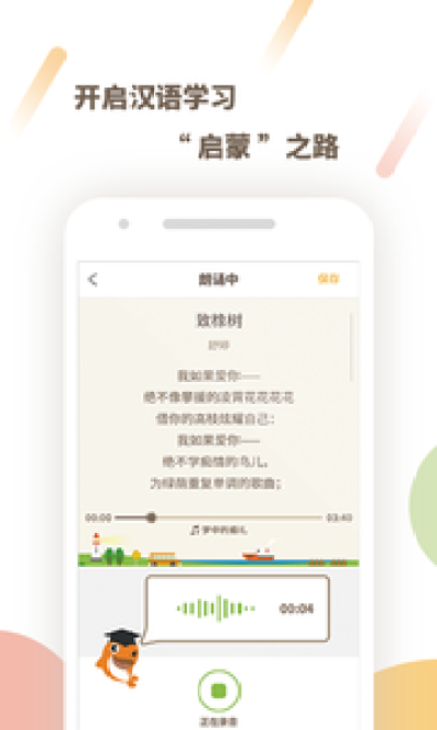 培养阅读习惯,可以从朗诵开始!提供不拘一格的古诗与诗歌诵读资源、多种多样的音乐资源,您可以根据自己的喜好挑选诗歌和配乐进行诗词朗诵,并可将您的诵读分享给朋友,获取聆听者的宝贵意见。
