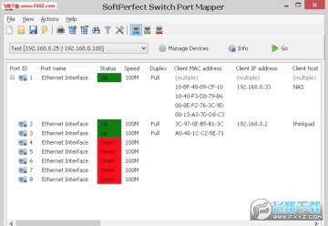 Softperfect交换机端口映射器是一种网络交换机管理控制台实用程序,它传递有关连接到交换机端口的硬件的数据,以及哪些端口没有连接。端口映射器列出了与每个连接端口相关联的计算机的MAC地址、IP地址和主机名。